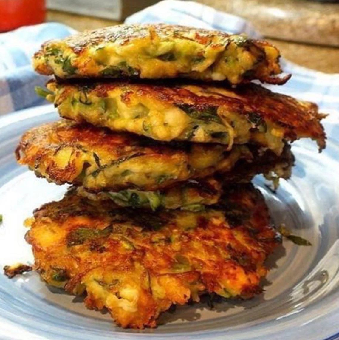 Then put oil in the frying pan and heat well. To make each fritter, take a scoop full from the mixture and place in your hand pat it down into a hamburger shape and place it into the frying pan. Fry the fritters for 2 to 3 minutes on each side until they are nicely browned. Place on paper towels to absorb the excess oil. Serve and enjoy!